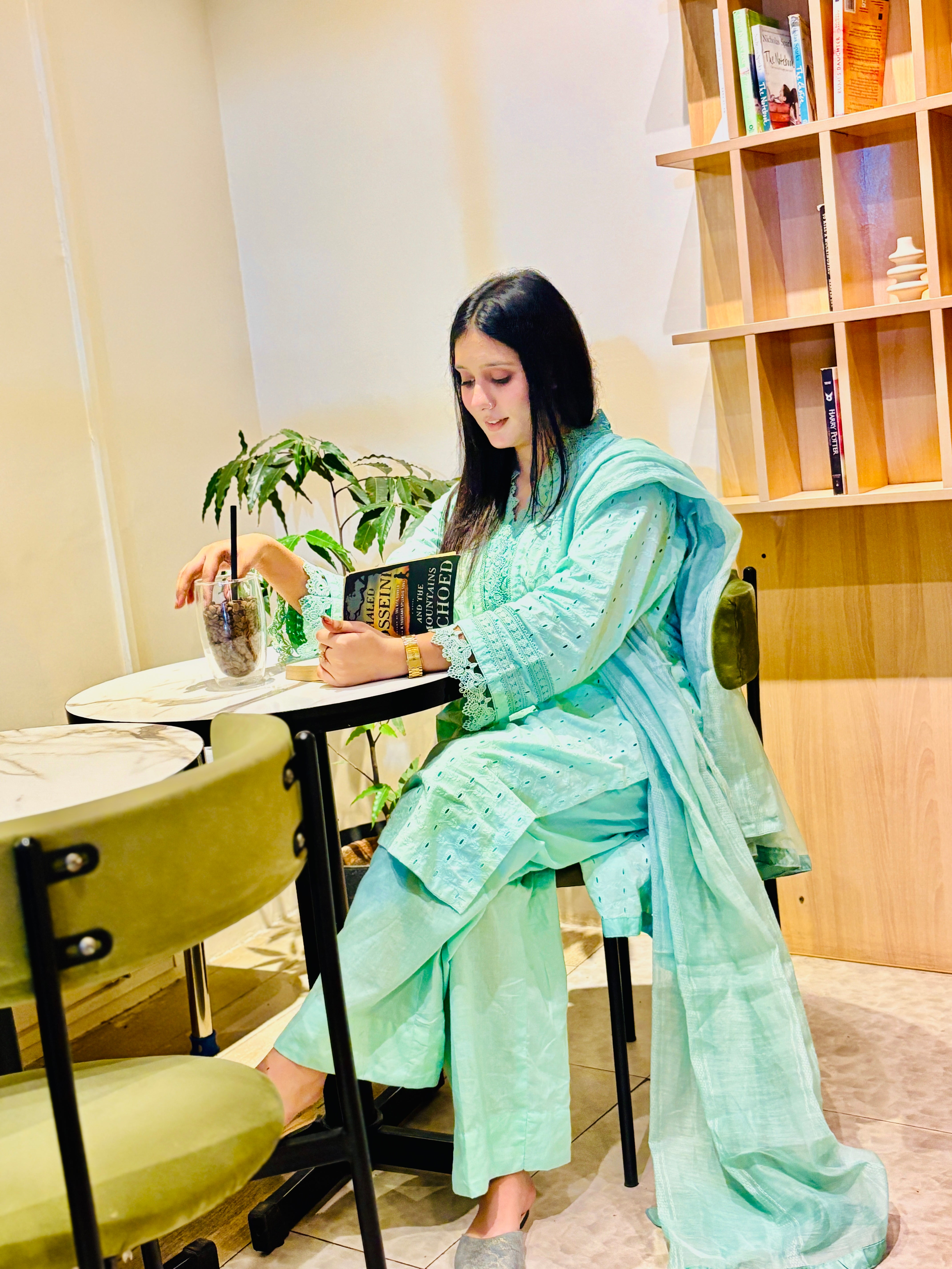 Nehr-e-Noor from BEBANO’s Gulzar Collection is a vision of timeless grace and refined elegance. Crafted from luxurious Chikan Kari fabric, this 3-piece ensemble features a beautifully adorned shirt detailed with milky laces dyed in matching tones, exuding sophistication in every stitch.